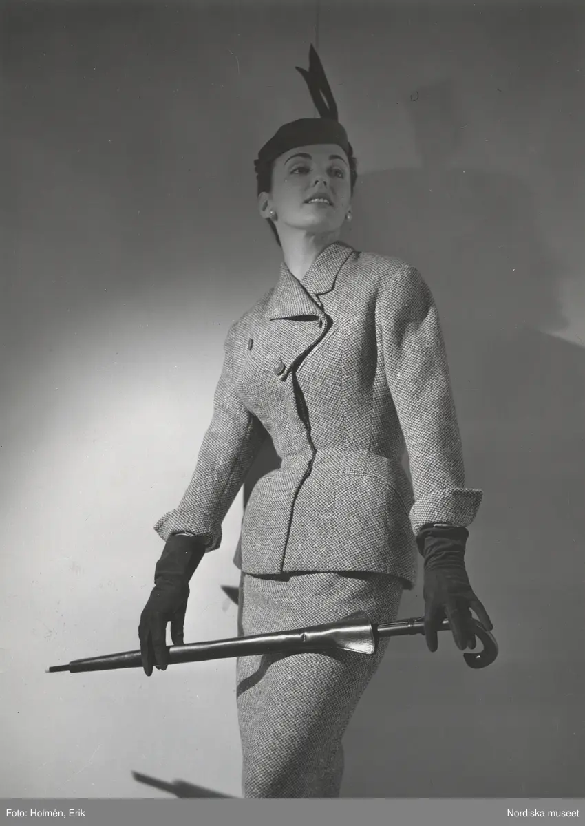 Modell i dräkt, hatt med garnering, handskar och paraply i handen. Från Balmain.