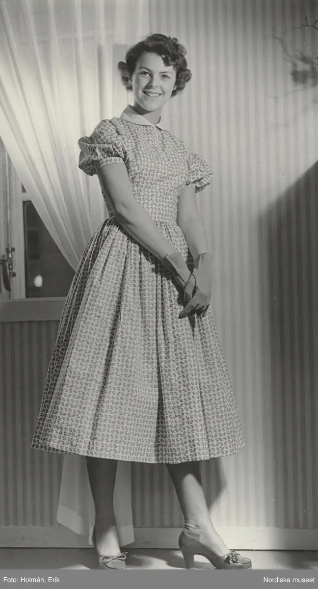 Tonårsmode visas i Kungsträdgården. Modell i roséröd klänning med puffärmar och handskar vid ett fönster. Tonnie-modellen. 63 :-.