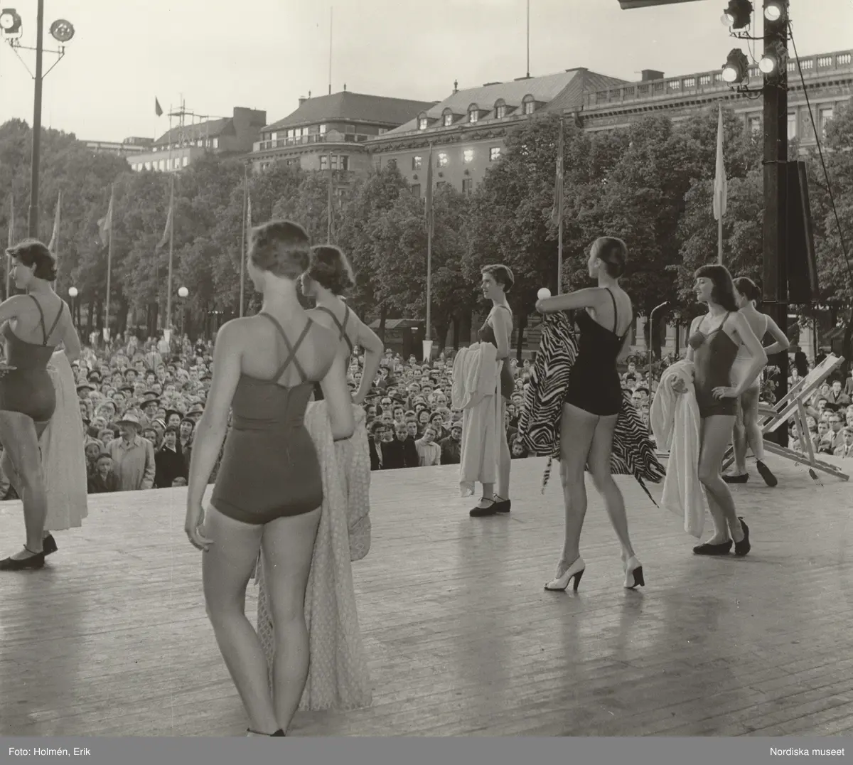 Lia Selmbert-baletten uppträder i Kungsträdgården i Stockholm, Nordiska Kompaniet. Modeller i baddräkt och badrock.