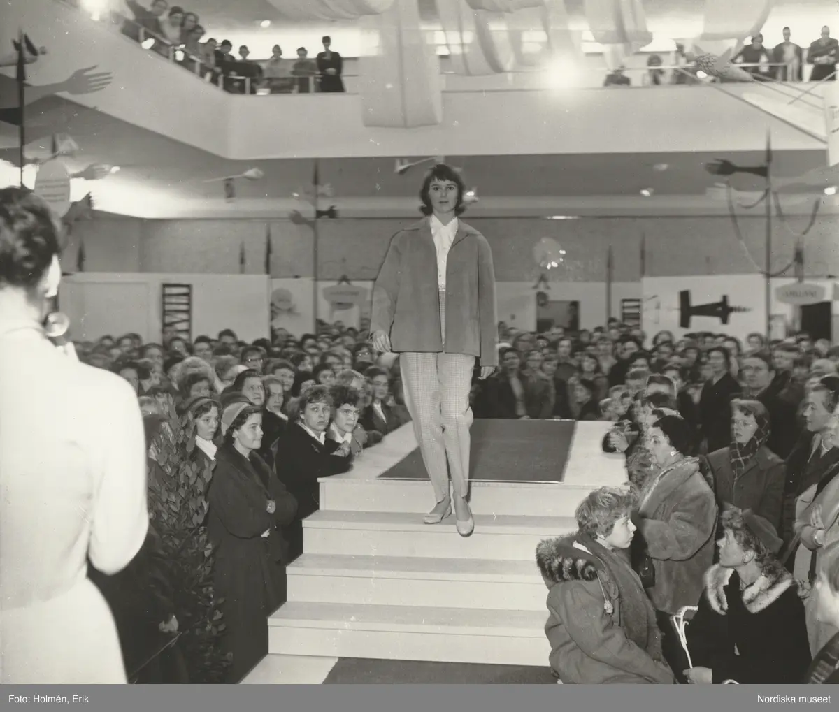 Tonårsmode. Modevisning. Modell i jacka, byxor och vit blus.