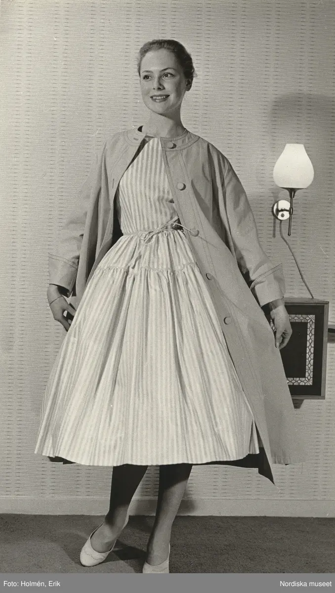 Kvinna i randig bomullsklänning, kappa i poplin från Wettergrens och pumps. Lampa på väggen. NK Atelier.