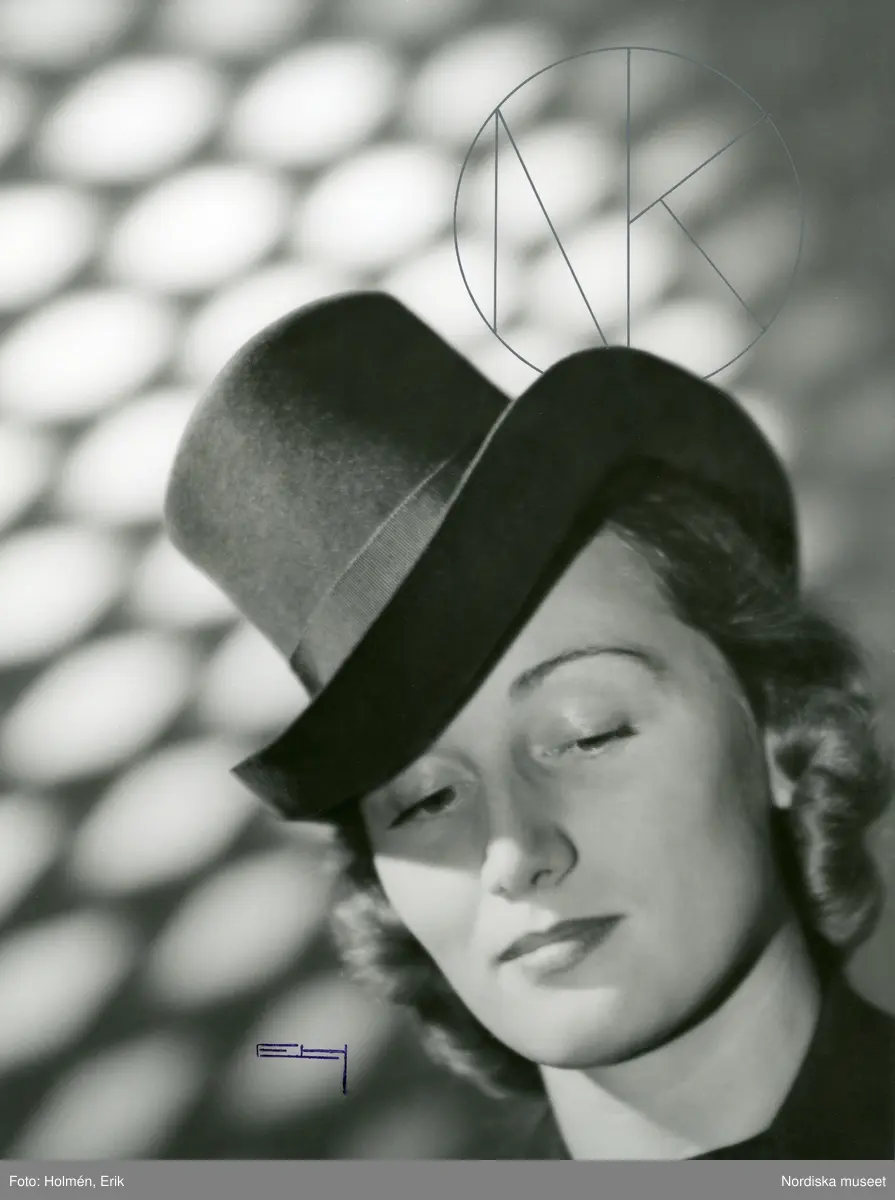 Porträtt av kvinna i hatt med band runt kullen. Skuggat mönster i bakgrunden.