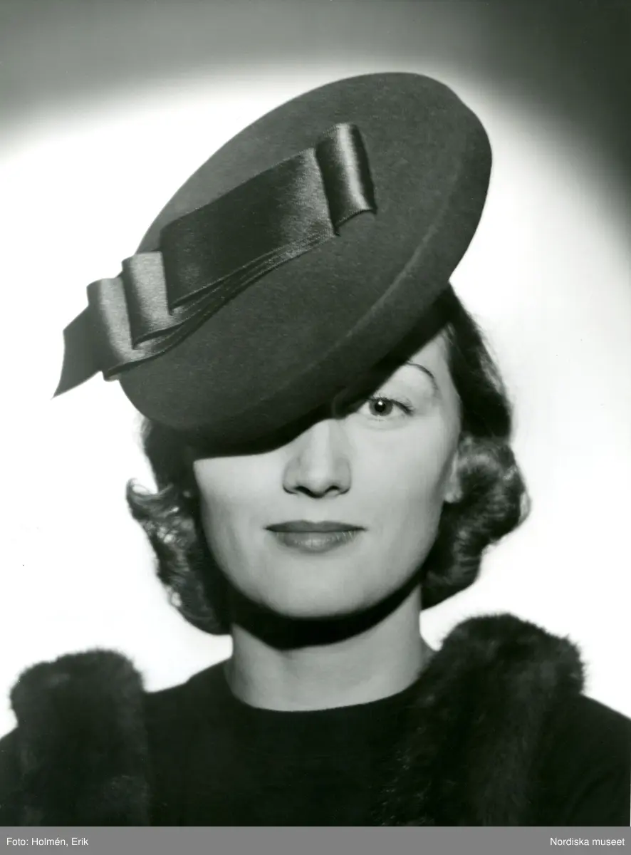 Porträtt av kvinna i hatt med sidenband.