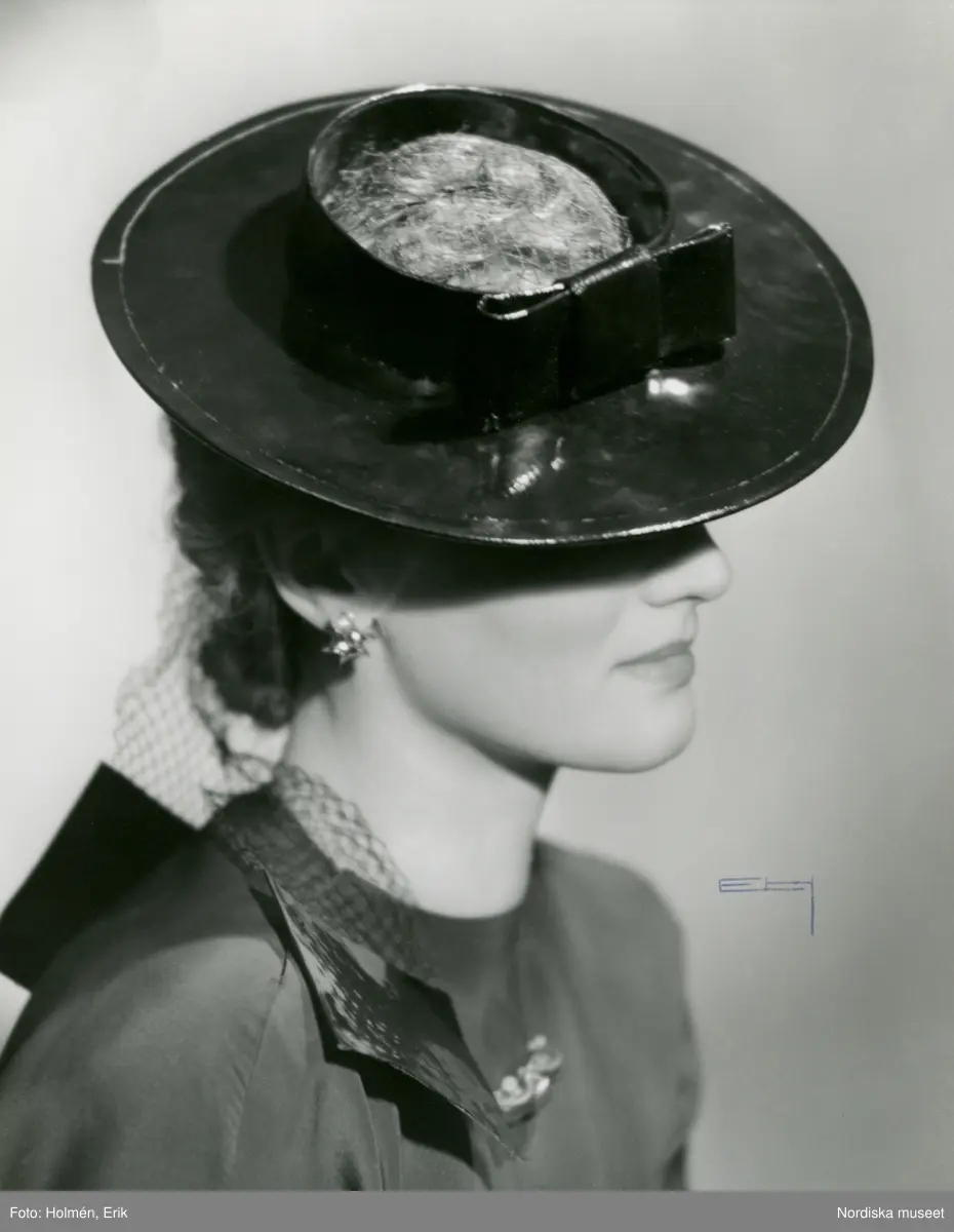 Porträtt av kvinna i blank, svart hatt med rosett och öppen kulle med ljust tyll, samt band baktill.
