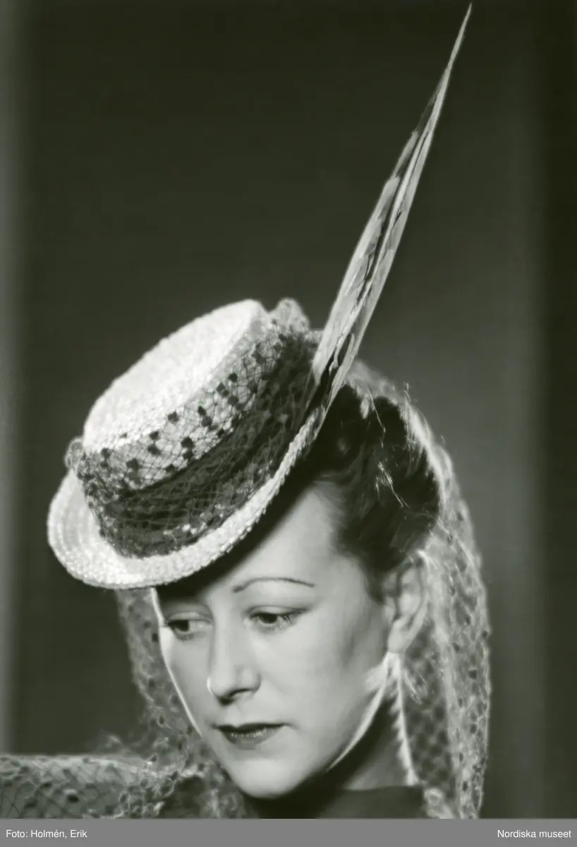 Porträtt av kvinna i stråhatt med mörkt flor och fjäder.