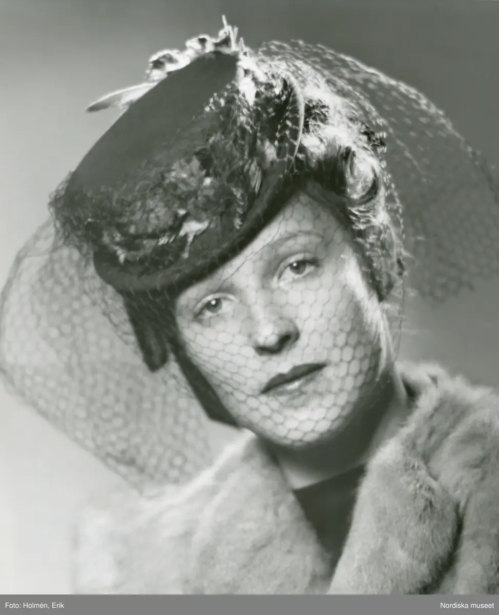 Porträtt av kvinna i hatt med flor och fjäderdekorationer runt kullen, från Hermine Schattenfroh.