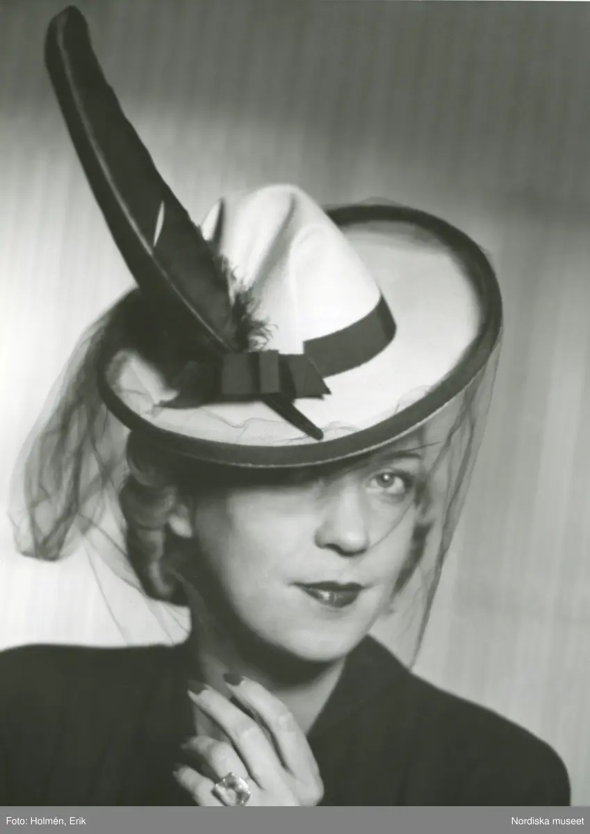 Porträtt av kvinna i ljus hatt med svart flor, band och fjäderpenna.