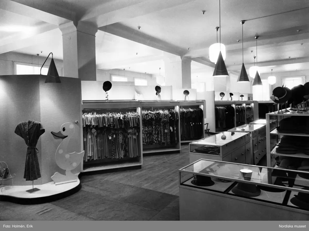 Interiör från Nordiska Kompaniet. Klänningar till vänster och hattar till höger. Bakom väggen till vänster finns omklädningsrum.