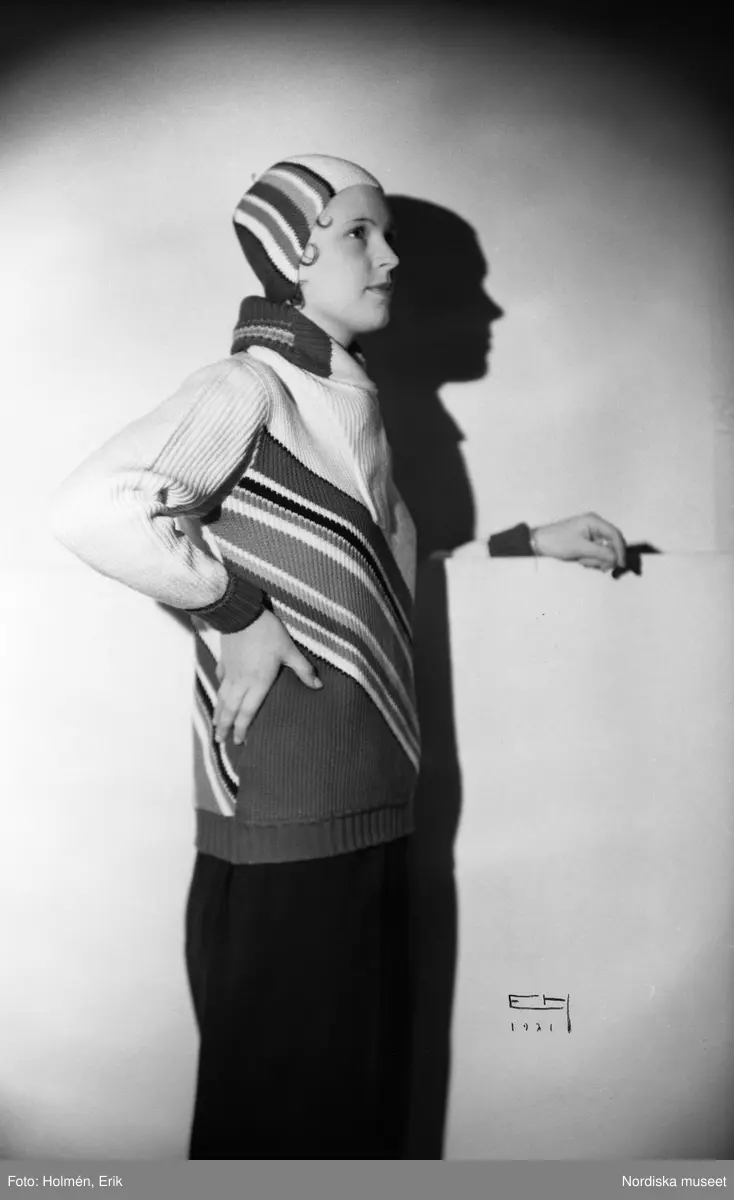 Modell i sportkläder. Stickad tröja och mössa med ränder, mörka byxor.