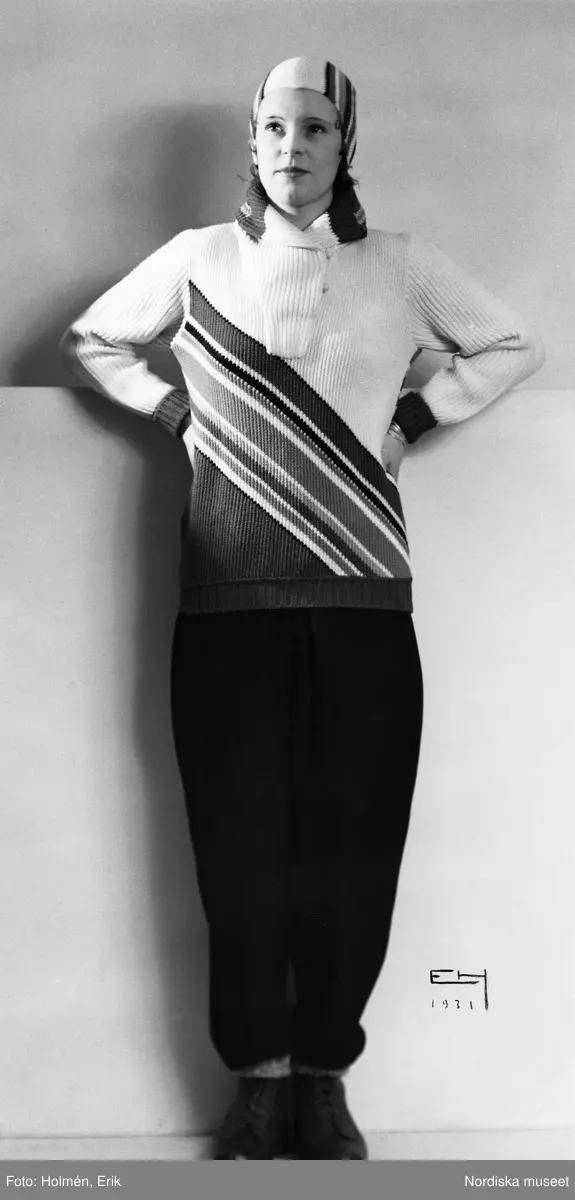 Modell i sportkläder. Stickad tröja och mössa med ränder, mörka byxor och pjäxor.