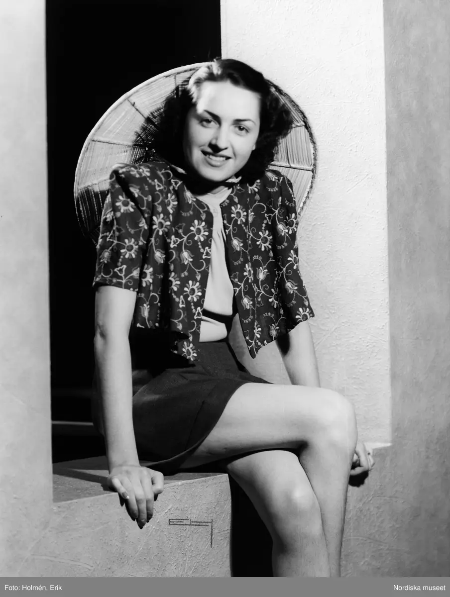 Modell i kort kjol och kort överdel med broderat blommotiv. Hatt hängandes på ryggen.