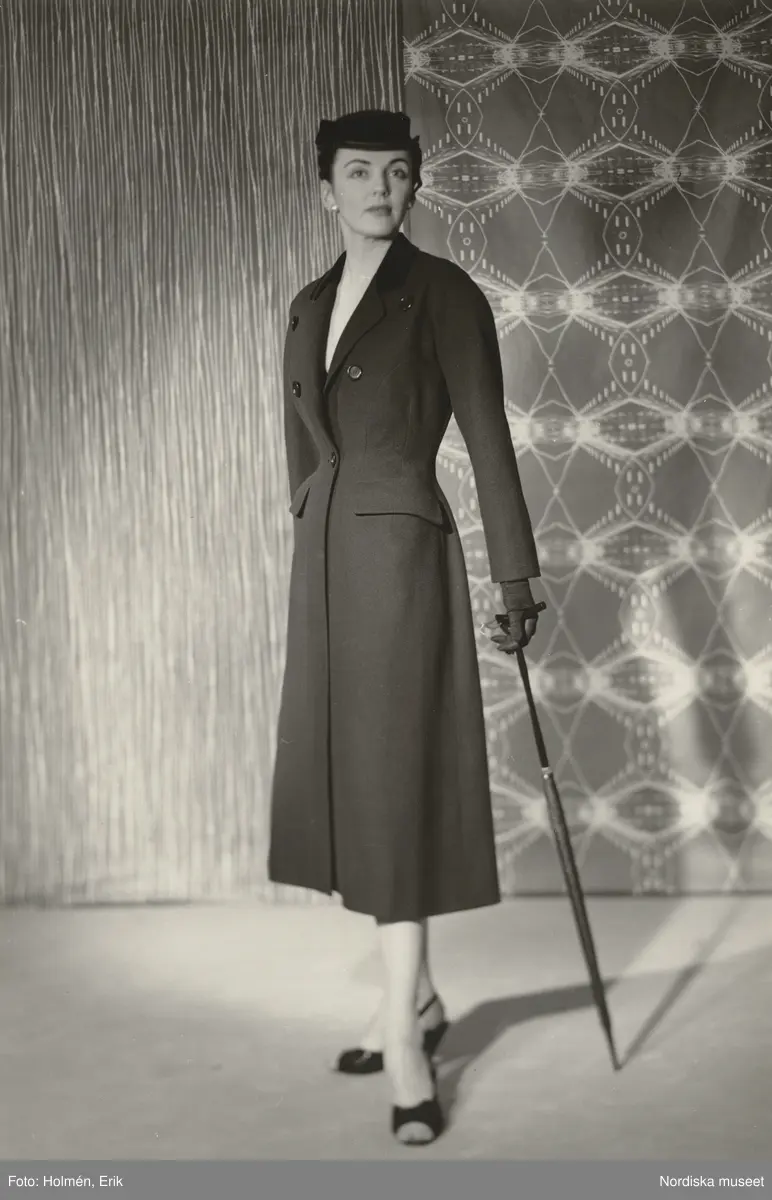 Modell i kappa, hatt och paraply. Från Madeleine de Rauch.