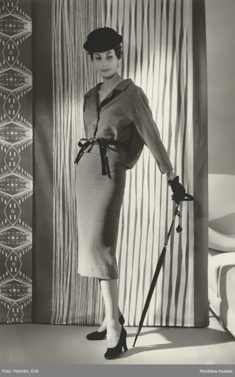 Modell i dräkt med band i midjan, hatt, paraply och handskar.