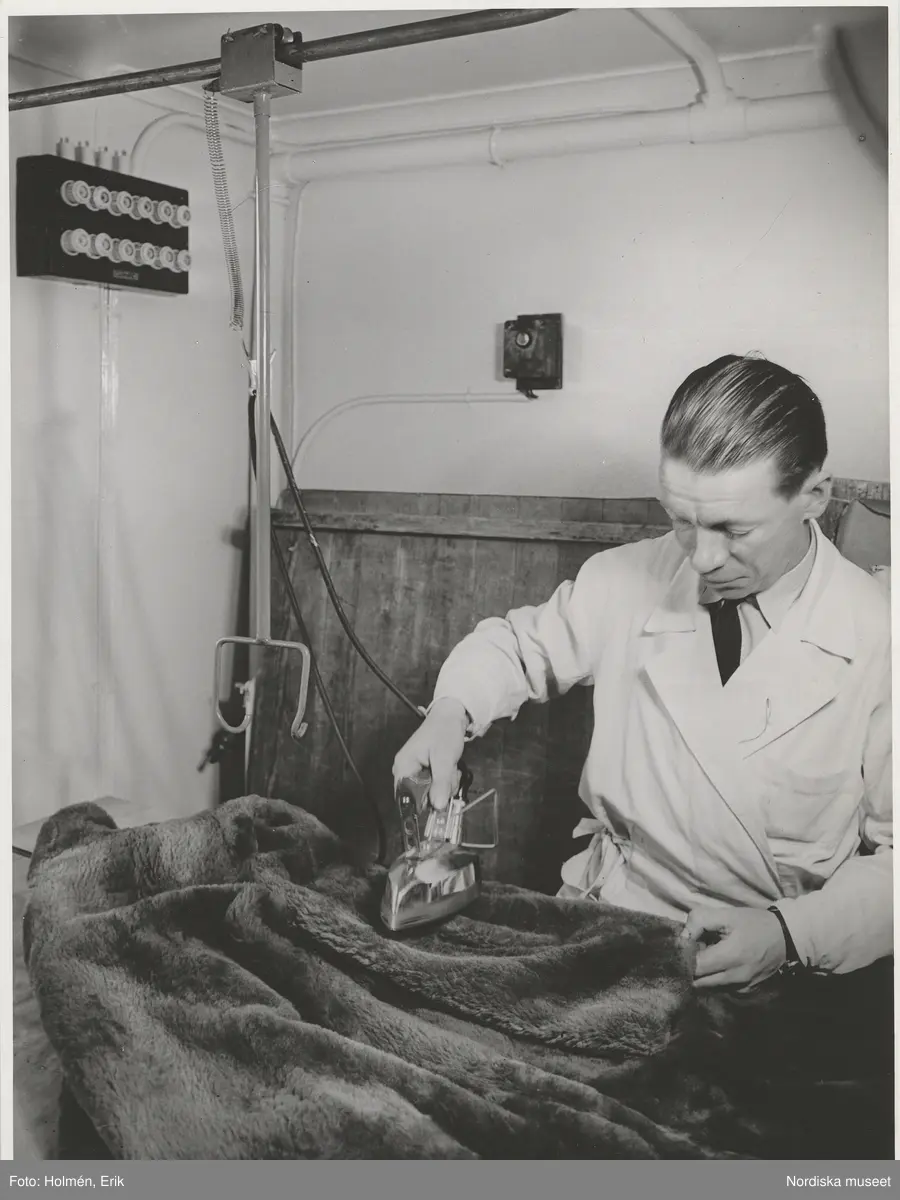 I pälsateljén. Bygling av päls för att få upp glansen. Man i vit arbetsrock arbetar med strykjärn.