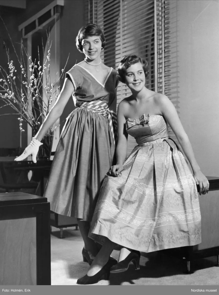 Två flickor visar aftonklänningar. Nordiska Kompaniet.