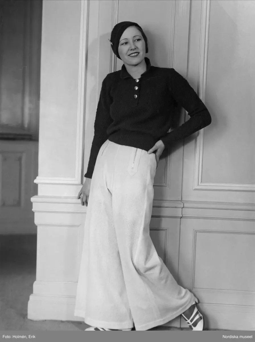 Modell poserar i ett par vita långbyxor. Nordiska Kompaniet.