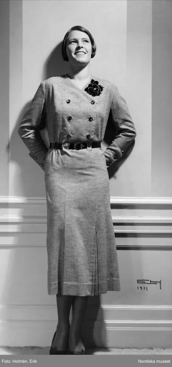Modell visar en klänning med dubbla knapprader. Nordiska Kompaniet.