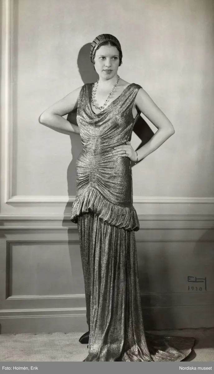 Modell poserar i en långklänning. Nordiska Kompaniet.