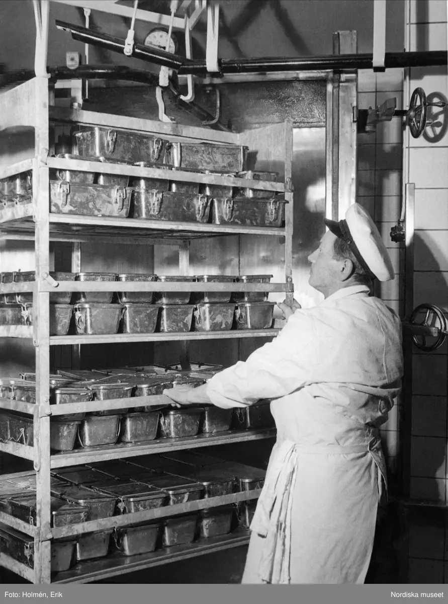 Man tar fram kantiner med mat ur frysen, Nordiska Kompaniet.