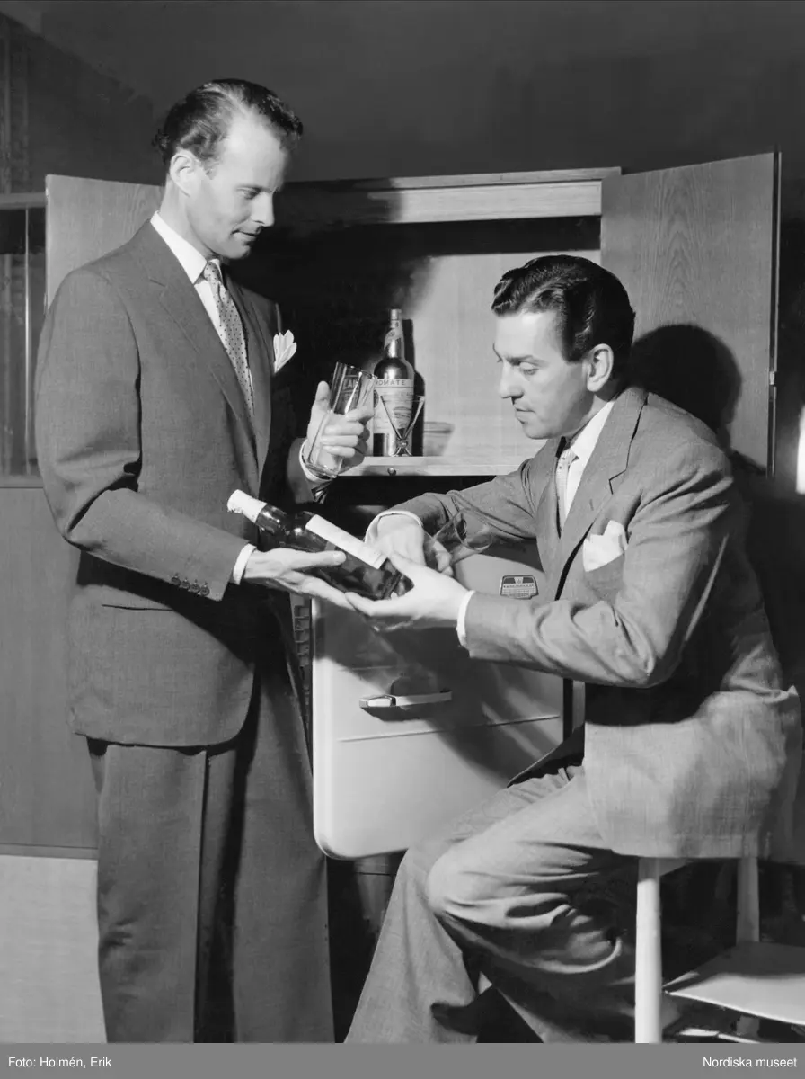 Två välklädda män väljer sprit vid barskåp med kyl. Nordiska Kompaniet.
