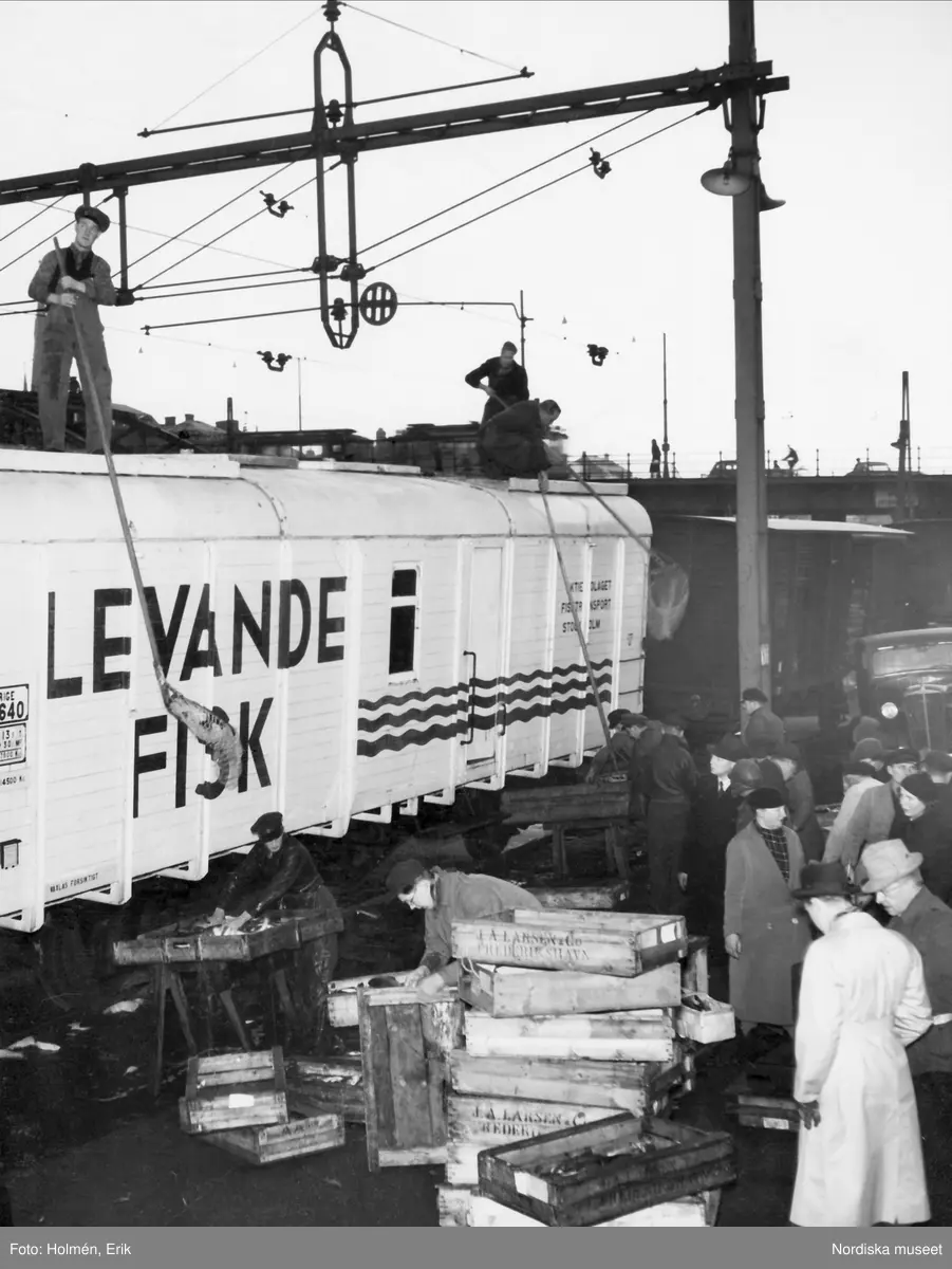 Fisk säljs direkt från järnvägsvagn. Nordiska Kompaniet.