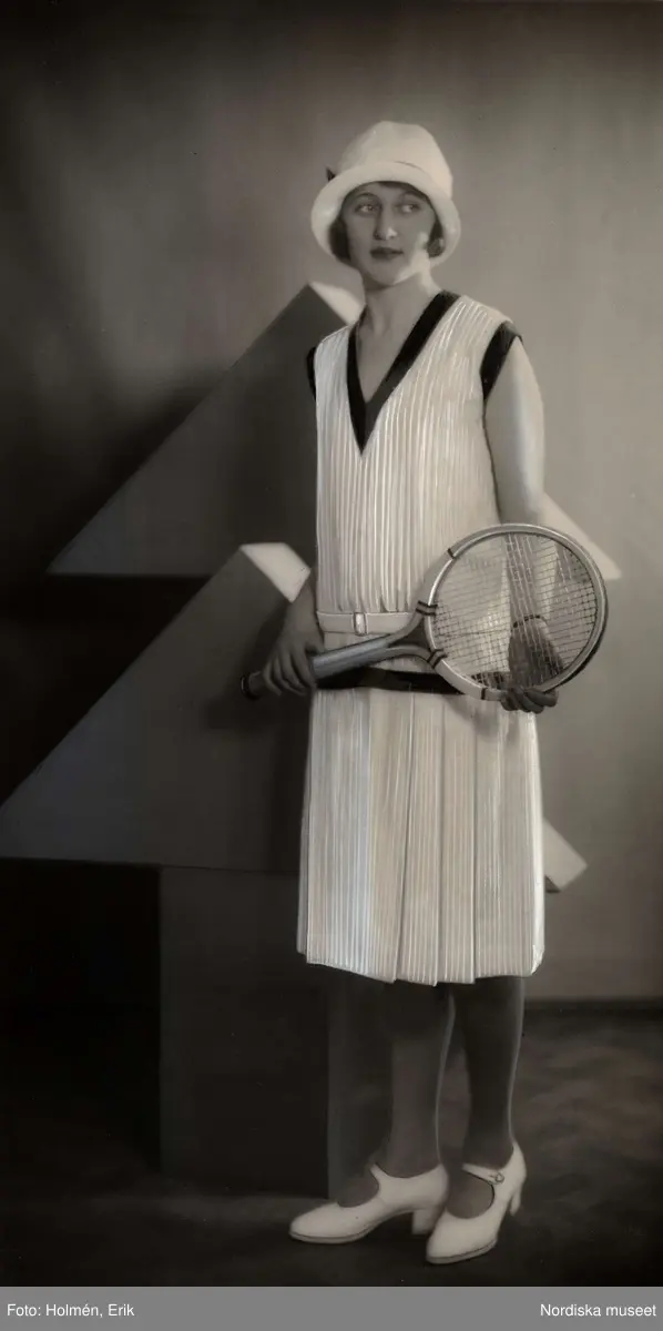 Kvinnlig modell i tennisdräkt med tennisracket. Nordiska Kompaniet.