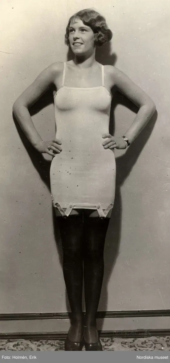 Dammode, Nordiska Kompaniet. Kvinnlig modell i korsett och strumpor.