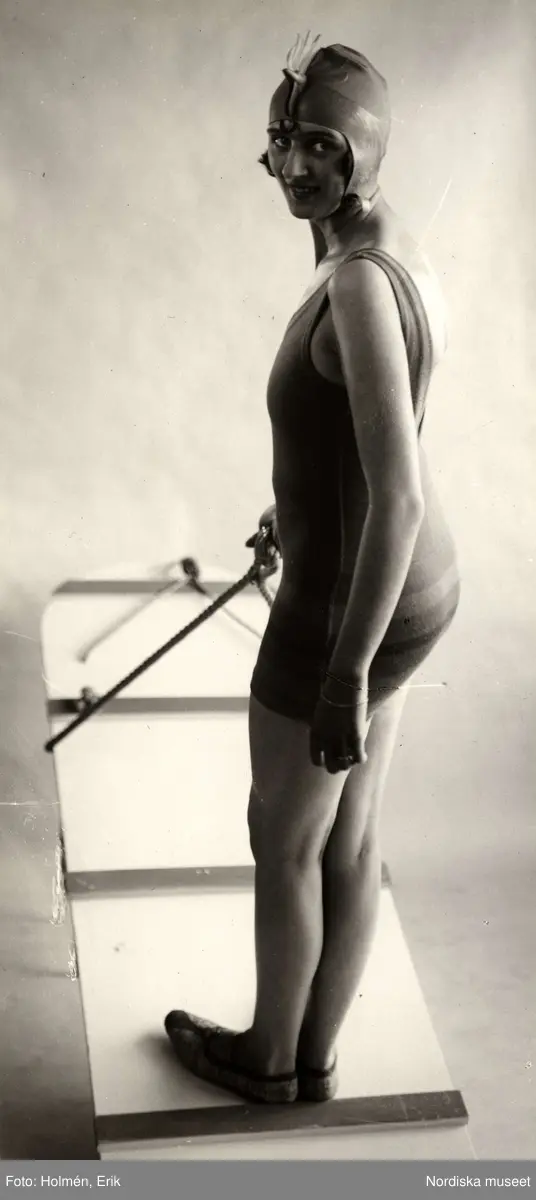 Kvinna klädd för vattenskidåkning. Nordiska kompaniet, Stockholm.