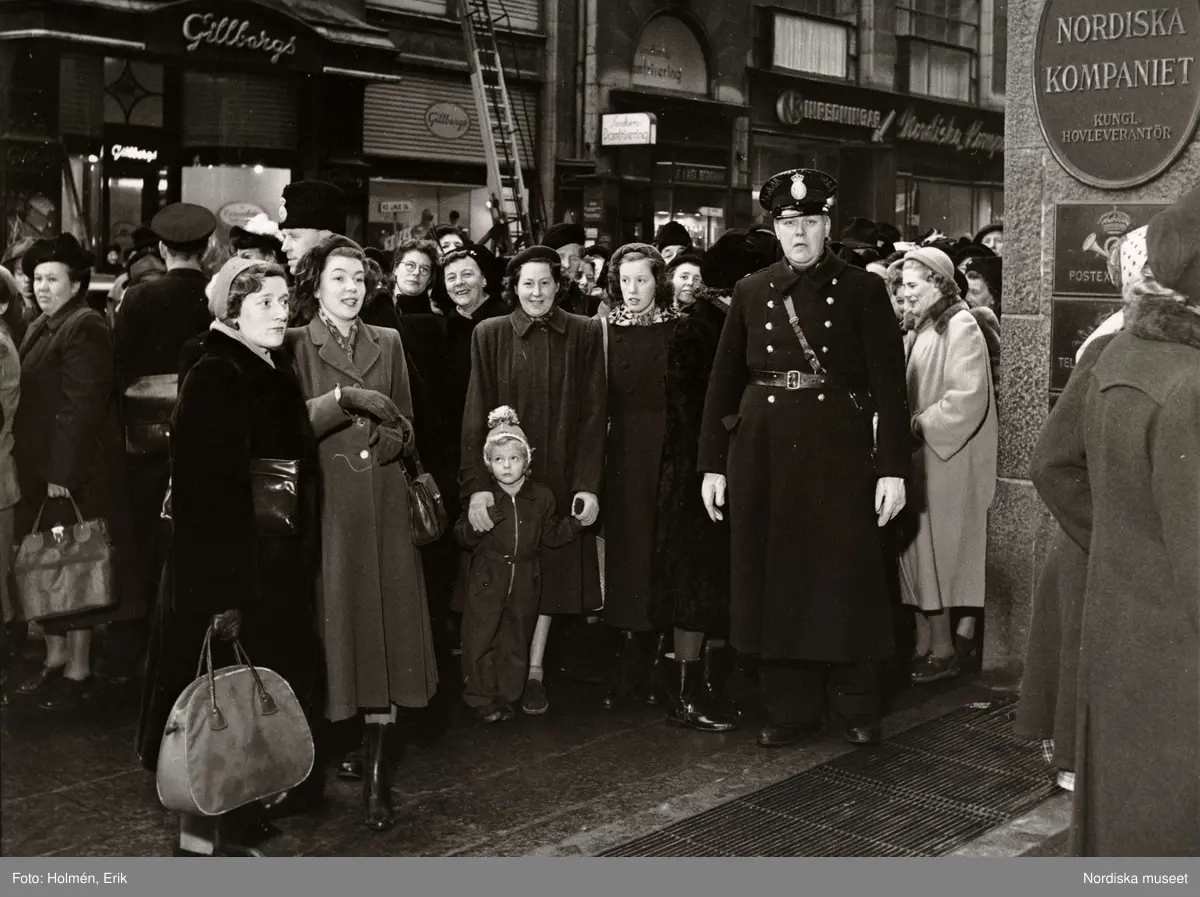 Folksamling utanför entrén till NK (Nordiska Kompaniet) i Stockholm inför realisationen, februari 1950.