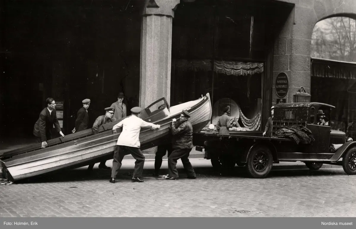 Lastning av en båt från Nordiska Kompaniet på lastbilsflak.