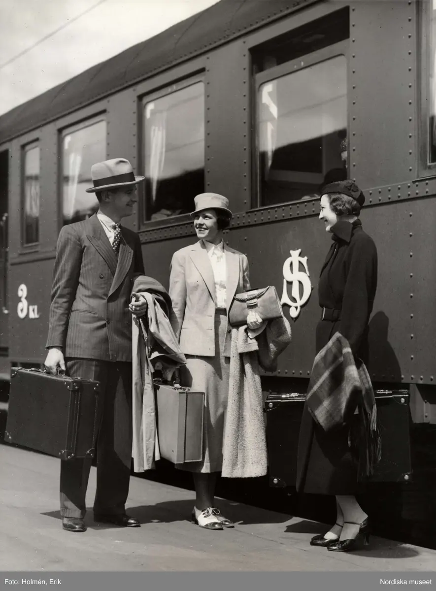 Reseeffekter, Nordiska Kompaniet. Två kvinnor och en man med varsin resväska utanför järnvägsvagn.