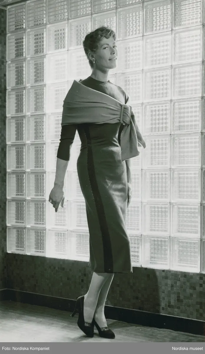 Modell i klänning i brun ylle med sjal i grön jersey, framför betongglas.