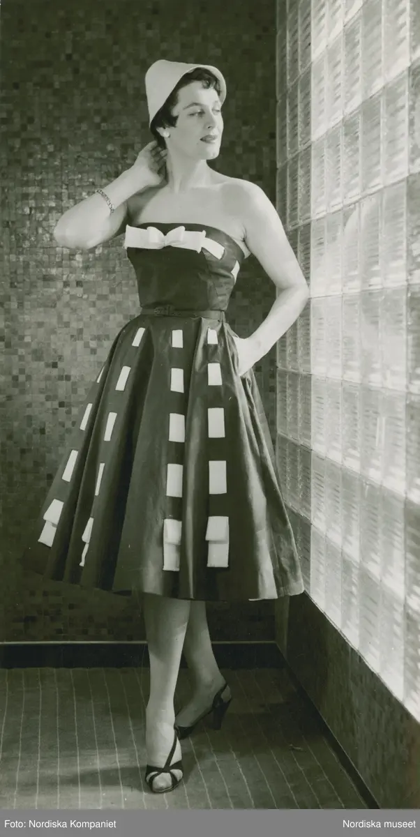 Modell i klänning med vita band, hatt och klackskor, vid betongglas.