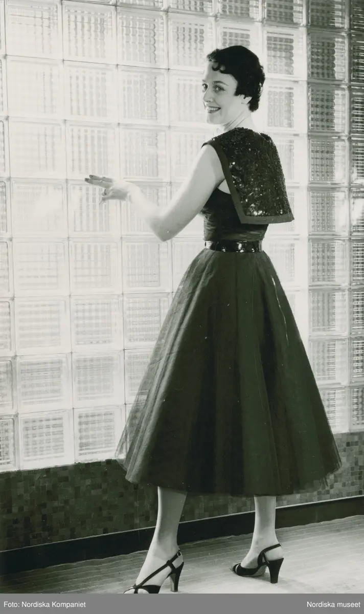 Modell i klänning med paljettsjal, vid betongglas. Modellbutiken.