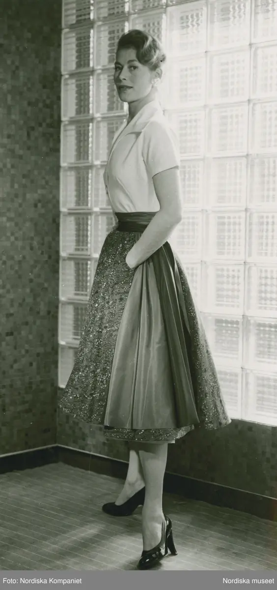 Modell i vit blus och kjol, örhängen och pumps, vid betongglas. Modellbutiken.