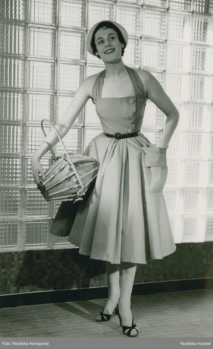Modell i klänning med skärp, hatt och väska med träpinnar, framför betongglas. Modellbutiken.
