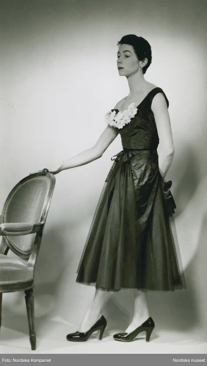 Modell i klänning med blomstergarnityr och pumps vid en stol. "Italiana".