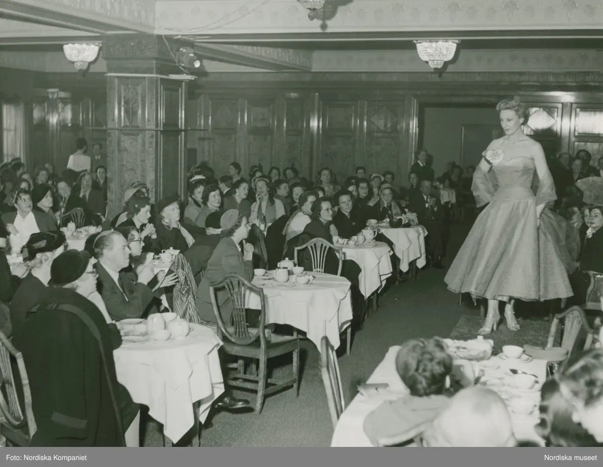 Modell i klänning med sjal. Modevisning på Nordiska Kompaniet. "Italiana".