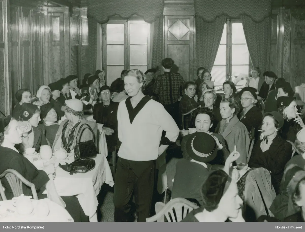 Modevisning på Nordiska Kompaniet, "Italiana". Modell i v-ringad tröja och byxor. Publik vid bord.
