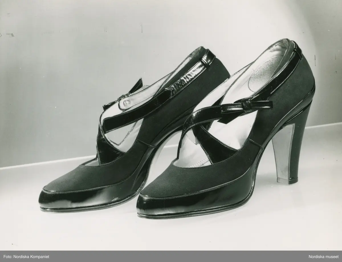 Sko med vristremmar, hög klack. Skinn och mocka