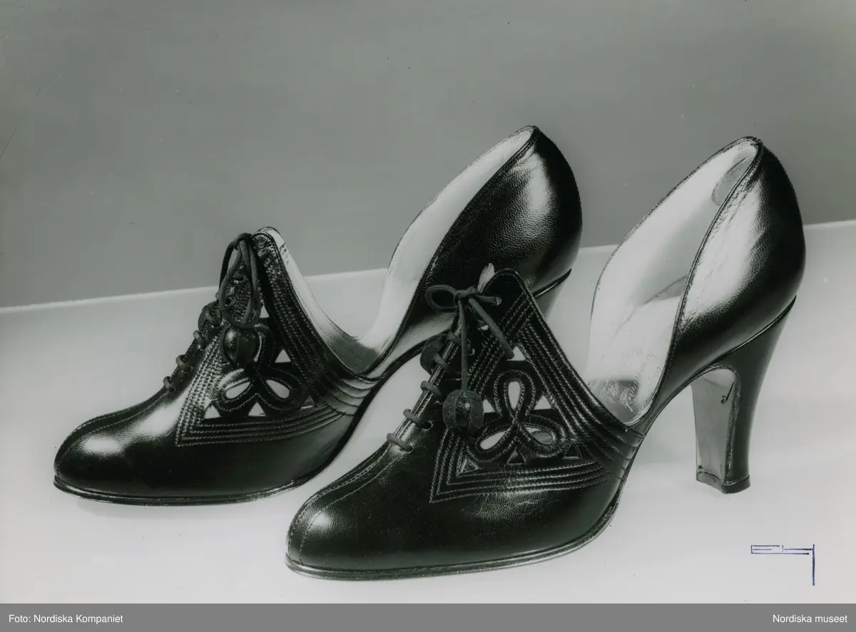 Skinnsko, högskuren, snörning, genombruten dekor.