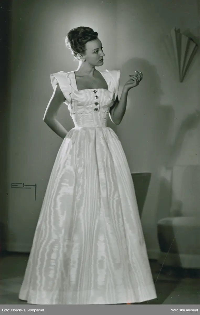 Modell i vit aftonklänning med utställd kjol.