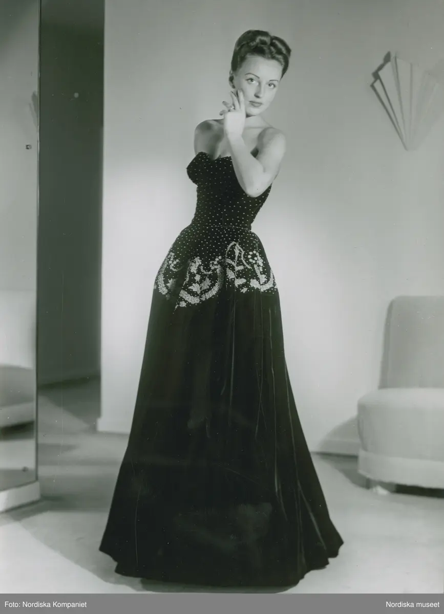 Modell i aftonklänning med prickig bustier. Soffa och lampa i bakgrunden.