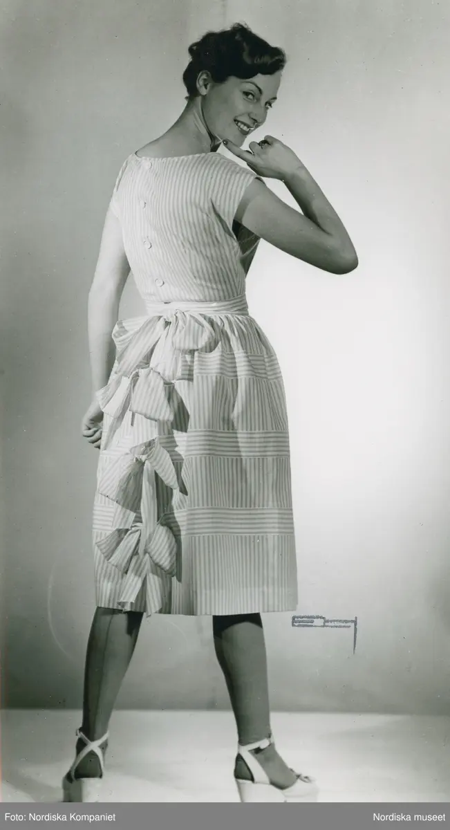 Modell i randig klänning med rosetter i ryggen och platåskor.