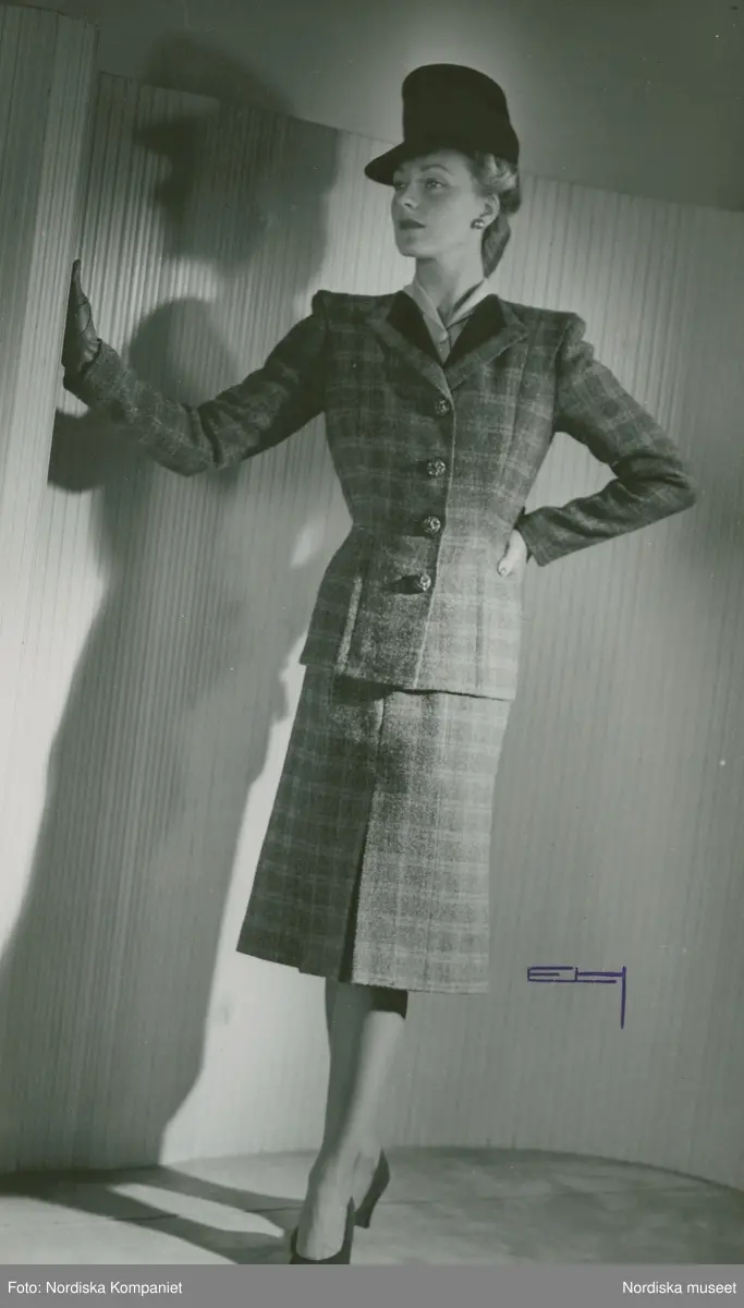 Modell i rutig dräkt, hatt med hög kulle och pumps.