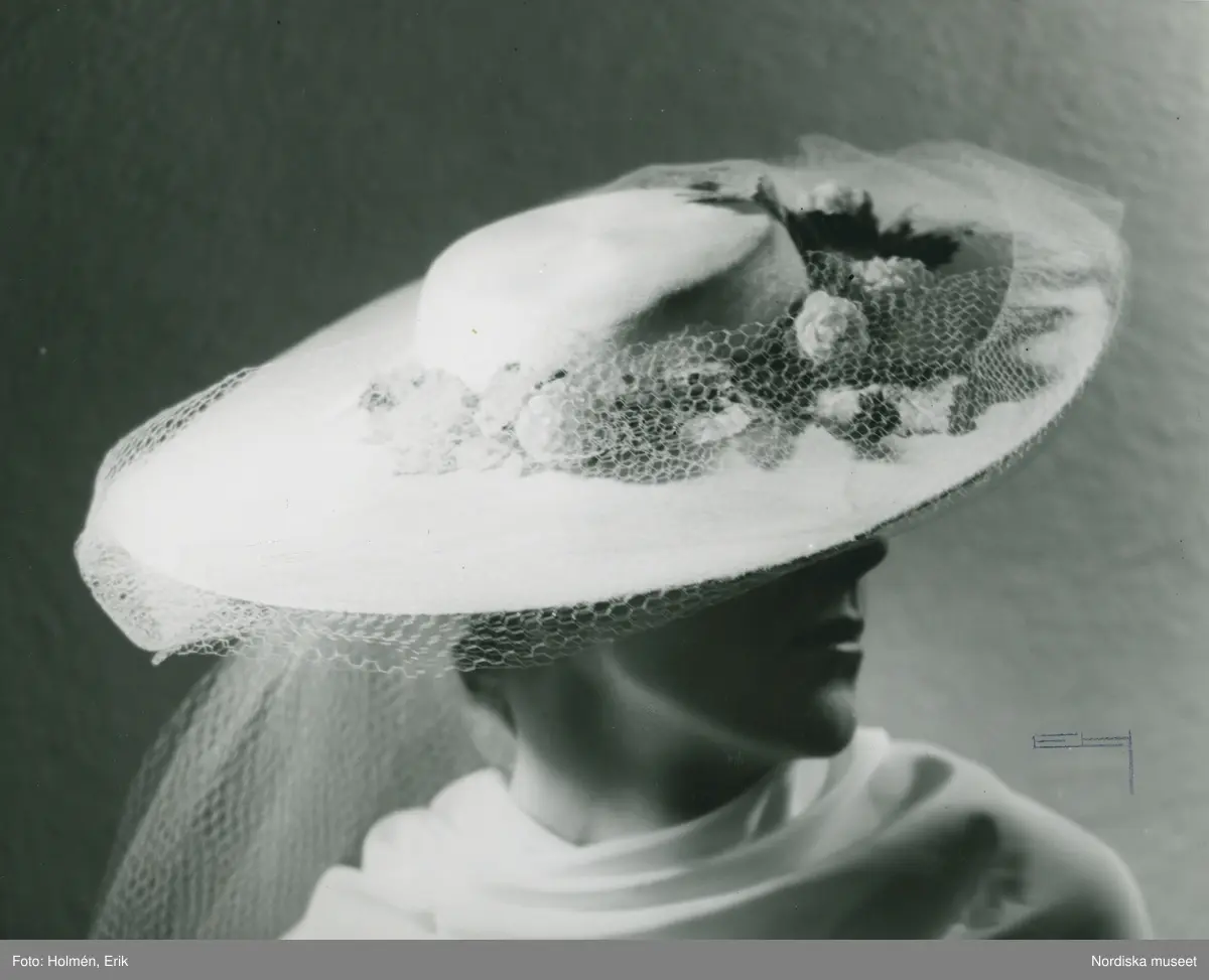 Fb, Porträtt av kvinna med hatt. Vit baku, vitt flor, blommor i mattgrönt.