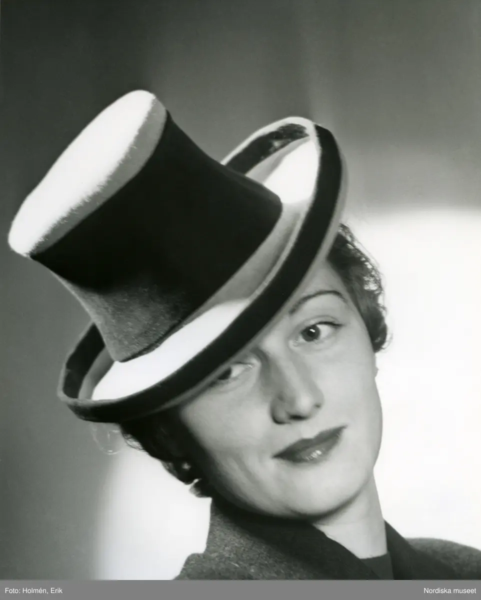 Porträtt av kvinna i hatt med brett hattband.
