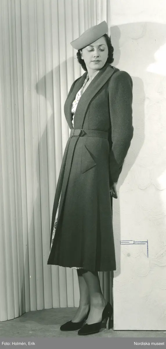 Helporträtt av kvinna i kappa, hatt och pumps.