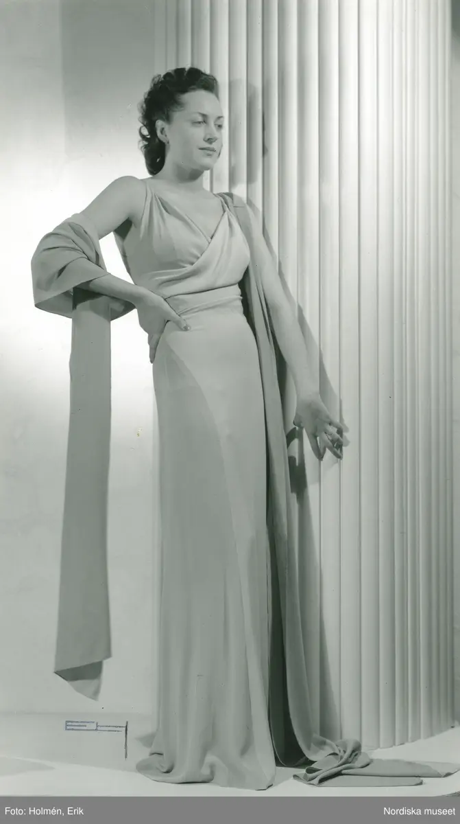 Helporträtt av kvinna med klänning i modell av Molyneux. Siden med lång sjal.