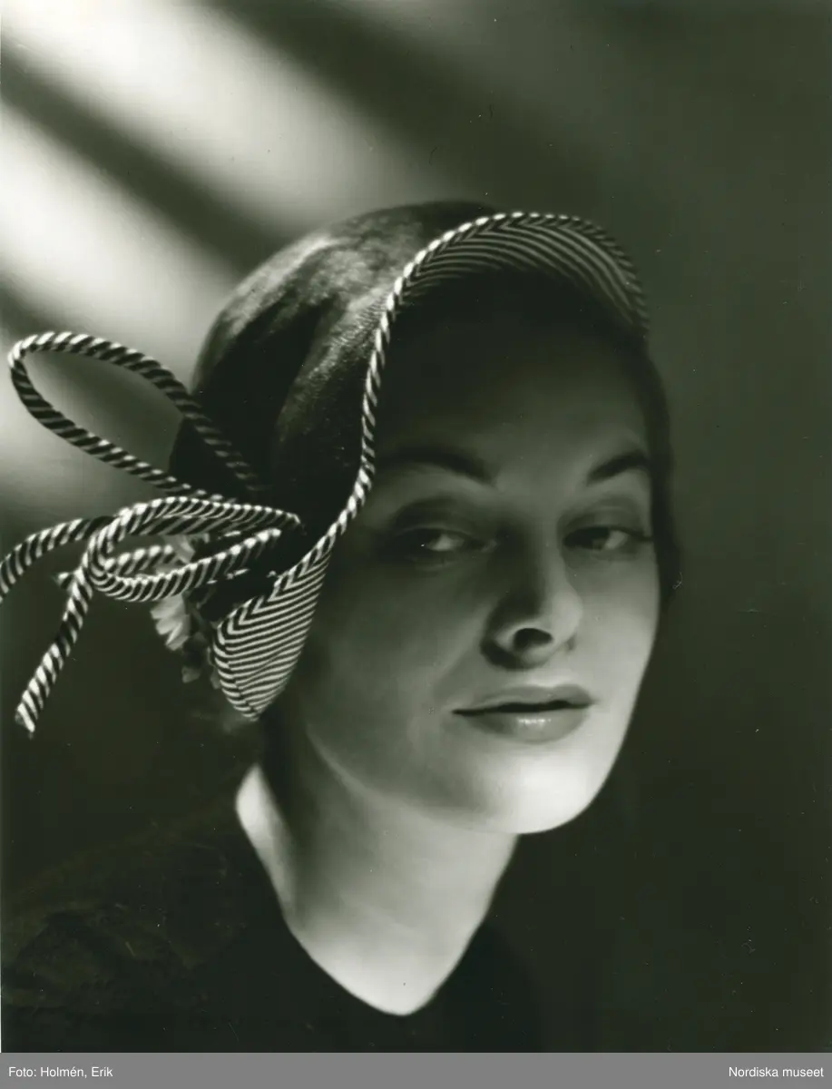Porträtt av kvinna i hatt med randig insida och band, av Jacques Fath.